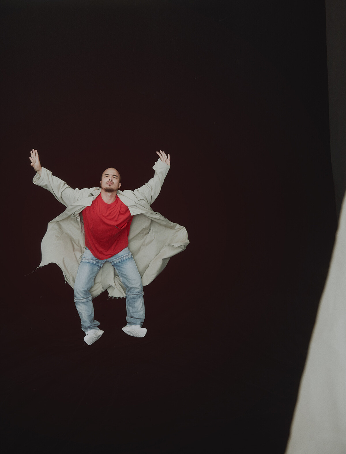 (Oversize 風衣、正紅色 T-shirt、拼接牛仔褲,all by Balenciaga;不對稱拉鍊休閒鞋,Camper。)