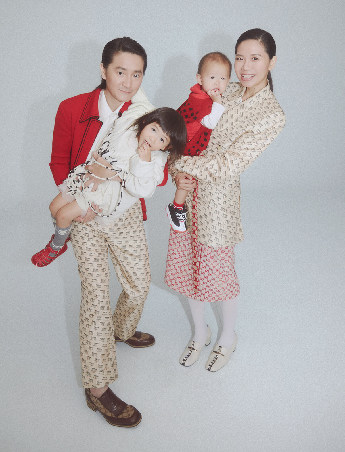 (小民:深藍緄邊針織夾克、米白襯衫、Logo 滑料長褲、皮鞋,all by Gucci。推機:滑料西裝外套、荷葉邊襯衫、針織 Logo 及膝裙、珠寶裝飾方頭跟鞋,all by Gucci;絲襪,私人提供。朵安:流蘇針織衫,Loewe;紗裙、菱格長襪、涼鞋,私人提供。品安:菱格背心,Prada;Polo 衫、內搭長袖、灰棉褲、條紋襪、球鞋,私人提供。)
