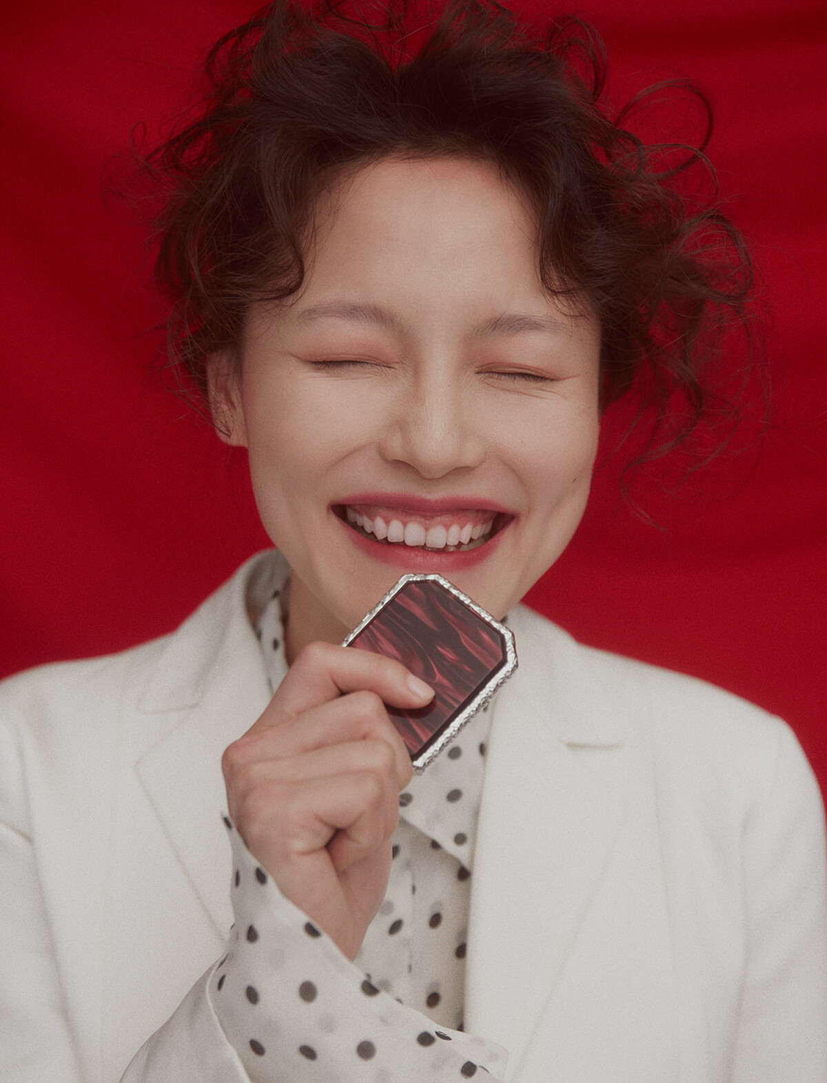 (西裝外套、雪紡圓點襯衫,both by Dior;耳環,Balenciaga。)