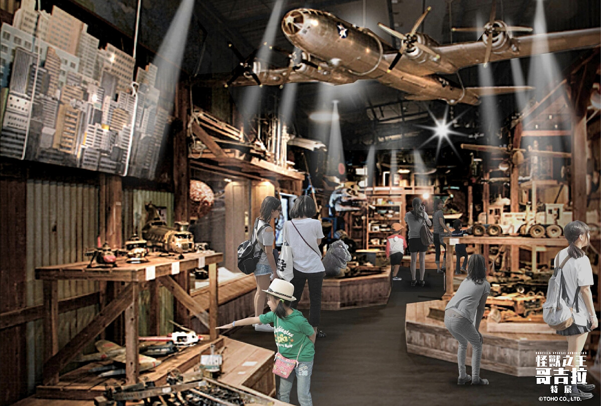 當設計師決定人物之後會在特殊美術部倉庫,加工製作裝扮角色的特殊造型,展示過去東寶特殊電影拍攝時實際使用過的飛機、船、戰車等造型道具。作業台上面有正在維修中的飛機等等,呈現出特殊美術工作人員工作的情境。