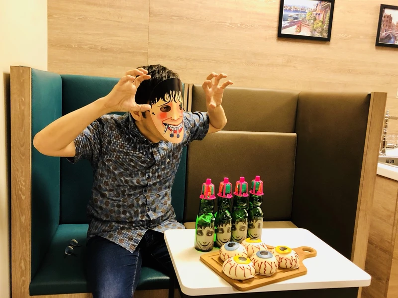 另外,你還可以在展場餐飲區中,吃到可怕又可愛的靈魂附體眼球包,在限定商品店裡買到台灣限定富江肉乾、富江啤酒;甚至在一樓票亭的「絕命顯影機」,與伊藤潤二漫畫中最喜愛的角色合影留念,把自己留在恐怖大師的漫畫世界裡!