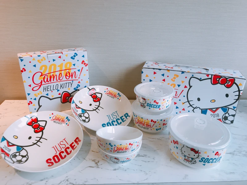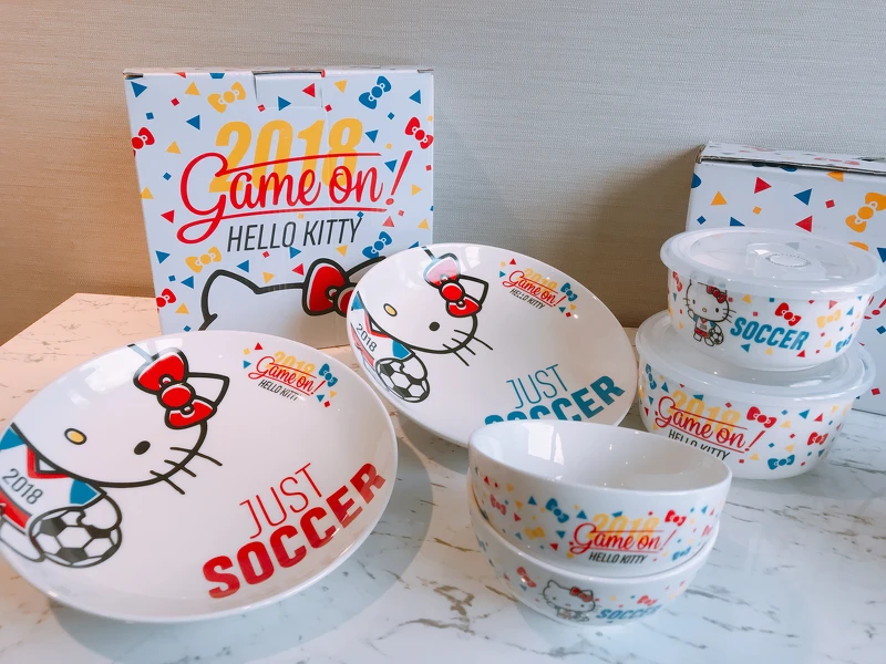 HELLO KITTY世足賽聯名系列包含「裝美味-HELLO KITTY餐碗2入組」、「裝活力HELLO KITTY餐盤2入組」、「裝熱情HELLO KITTY保鮮碗3入組」等。每一款皆採用強化新骨瓷精製,可耐高溫且適用於微波爐(不含保鮮碗塑膠蓋)及洗碗機。