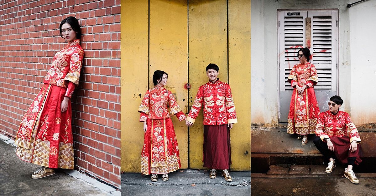 沒錯!傳統的龍鳳掛配上金色的運動鞋,中西合併的衝突美,也為整體造型帶來許多新鮮感!