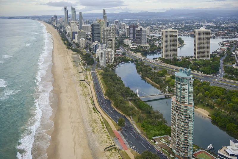 比賽當天清晨5:00,我們起床了!冬天的澳洲這時天還沒有亮。澳洲馬拉松起跑時間跟台灣的冬天賽事差不多都落在7:00附近,本以為時間很充裕的我們,慢慢整裝吃早餐、搭著貼心大會提供當日免費的輕軌捷運,想不到到了會場竟然也已經接近快起跑的7點了。一陣匆忙的寄物、拍照(還有時間拍照?)後,好在在鳴槍前10分鐘完成所有的手續!不過還未熱身的我有些緊張,又想提前到起跑區佔個好位置,但沒熱身直接跑出去的話對我來說根本是自殺。但到了起跑區發現起跑區比我想像中大多了,根本不需要人擠人的佔位置。看到旁邊還有許多跑者與菁英選手都還在旁邊熱身,於是我也一同加入他們。邊熱身,起點的大會主持人也開始開始朗讀熱血又激勵的開場白。時間一分一秒接近,雖然身體還沒完全暖開,但也真的需要就位好等待鳴槍了。看來黃金海岸馬在國際推廣有成,望眼過去各式各樣人種都有,甚至有亞洲黃種人數根本不輸白種人的有趣畫面。我站在3:20與3:10配速車長之間,一聲清晰的槍聲響起,隊伍開始快速移動,不到30秒的時間,我踩到踏墊、按下手錶的Start鍵,我的南半球馬拉松初體驗正式開始。