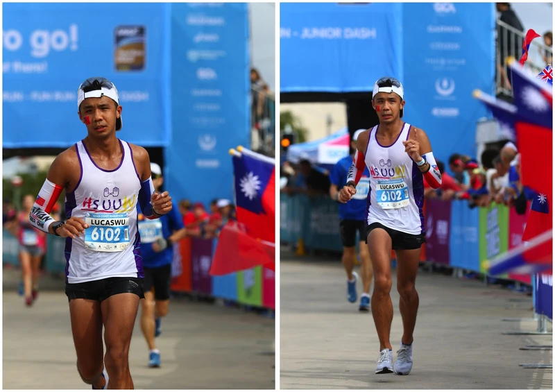 終於到了終點前的最後一個轉彎,也就是倒數的200公尺左右,這時旁邊塞滿滿的加油觀眾,雖然如此,我的腳不只重如千斤,兩腳大腿都處於快抽筋的狀態,頭暈想吐的我真的好想走路。這時我看到左前面方一塊有著滿滿中華民國國旗在揮舞,原來是iTaiwan的休息專區外,大家很努力的加油揮著國旗,這個畫面是真的挺感人的!於是我將手抬起致敬。我看著手錶的時間,離3:20剩下約30秒的時間。