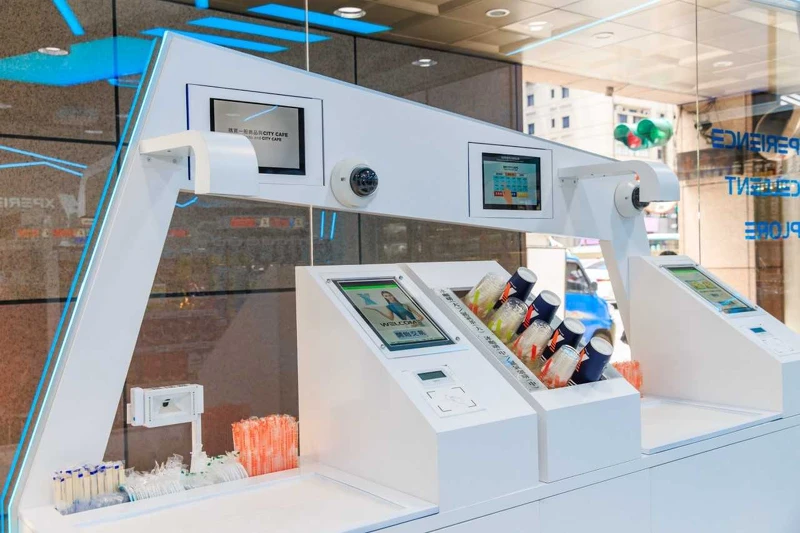 「X-STORE」2號店共有26坪的空間,設有18個座位,以星空藍與銀河白為主色系,打造科技感,.入店方式採臉部生物特徵辨識或刷卡兩種,而在結帳區更建置最新商品辨識系統及自助掃描條碼2種模式,有兩台自助結帳櫃檯,只要臉部辨識系統確認個人身分後,再以icash2.0靠卡付款即可。