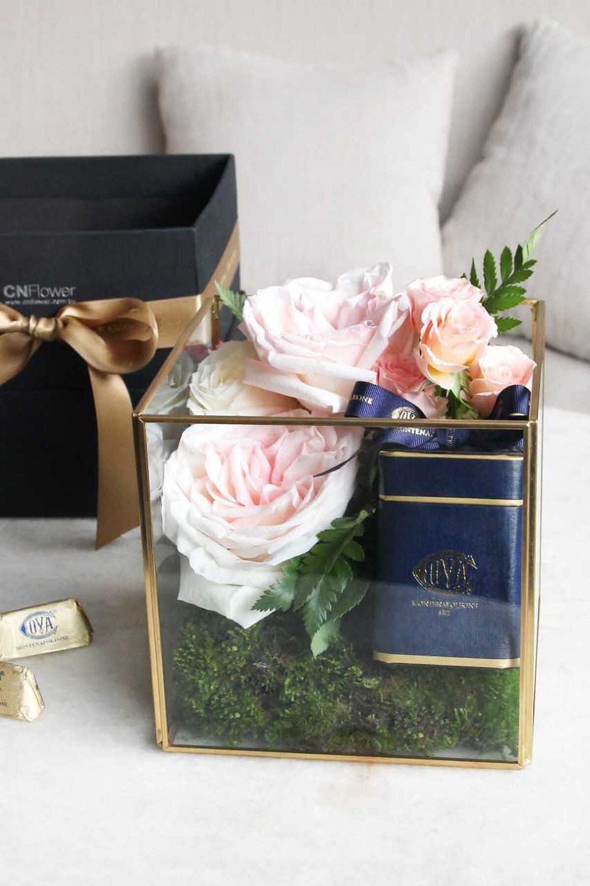 結合禮盒花和巧克力,分別有紅玫瑰與粉色庭園玫瑰可選,搭配COVA由米蘭空運直送的百年手工巧克力,完全就是最佳告白聖品,而金框花器更能獨立取出作為擺設容器,讓情意無限延續。