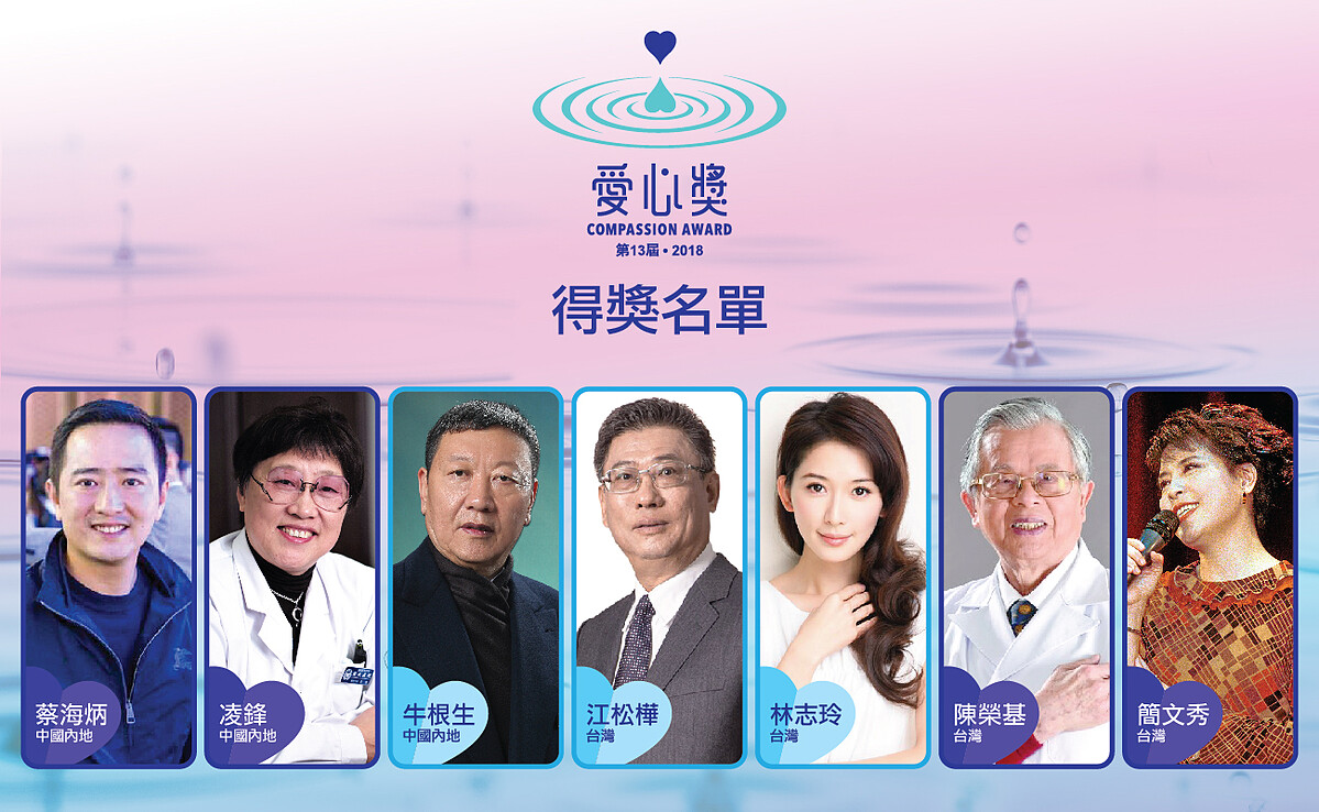「善經濟引領公益潮流,推動企業做有社會價值的事。」備受華人世界重視和肯定的第13屆‧2018「愛心獎」秉承此宗旨,以愛心、善心連繫海峽兩岸四地,甄選出7位得獎人 —台灣:江松樺、林志玲、簡文秀、陳榮基;中國內地:牛根生、凌鋒、蔡海炳,他們在慈善界展現卓越的領導能力、堅持不懈助人的愛心事蹟,每位獲頒13萬美元獎金。港澳台灣慈善基金會「愛心獎」將於12月19日(星期三)6:00p.m.在香港舉行頒獎典禮,由鳳凰衛視協辦和製作,12月29日(六) 9:40-10:45p.m.於鳳凰衛視中文台播出,香港台、美洲台、歐洲台周末黃金時段重播。