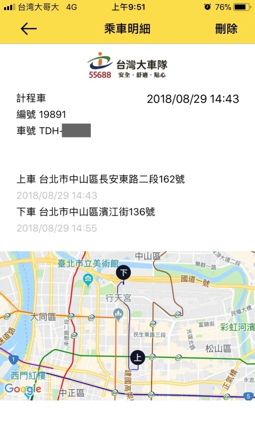 使用55688APP叫車,乘客不僅可以即時在APP上看到行車路徑;下車後,完整的路程也都會記錄在APP當中,可供乘客在【乘車記錄】中查詢。此外,計程車的編號、車牌以及上下車的時間與地點,也都會在記錄中完整顯示。