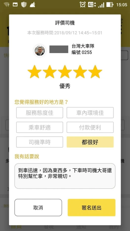 下車後,55688APP會自動跳出評價司機的畫面,可根據司機服務給予適當的評價以及建議,乘客的鼓勵與肯定,將會是司機最大的動力!