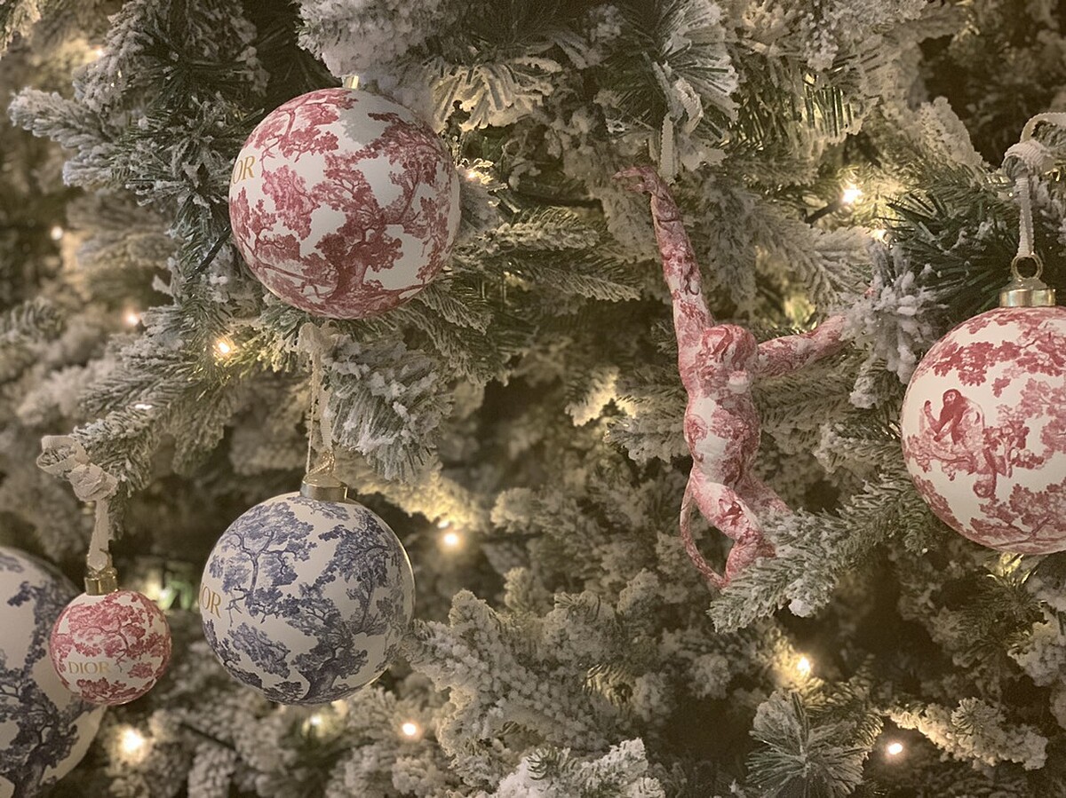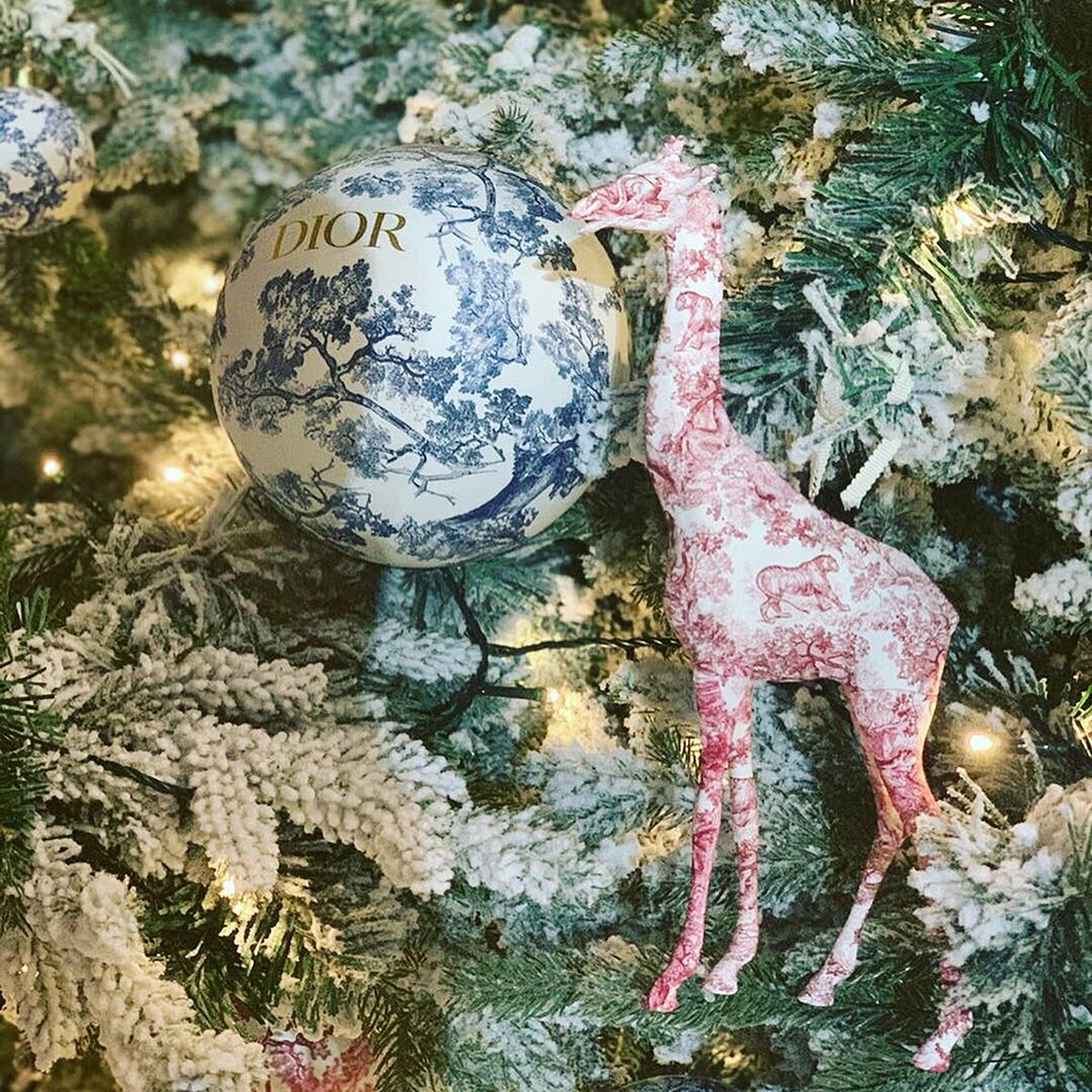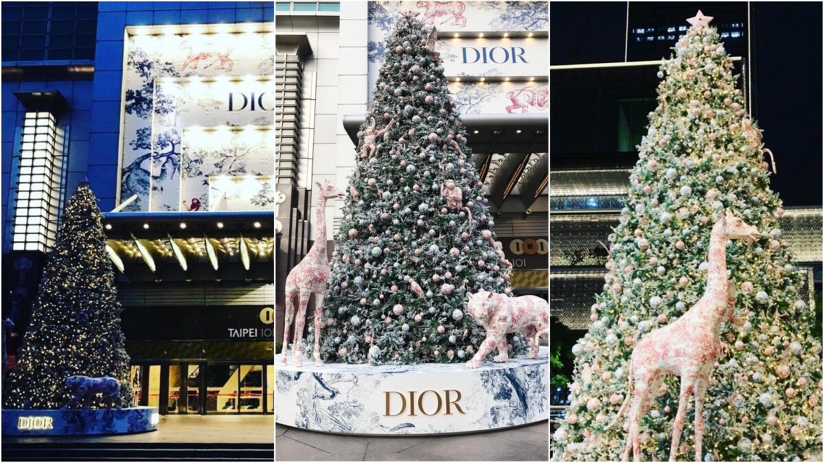 全球唯一一座DIOR聖誕樹就在台北 !位在松智路的101入口,今年由DIOR打造全球首座聖誕樹,這座聖誕樹將近三層樓的高度,共使用約1000顆燈泡、1000顆聖誕球、120隻小動物作裝飾,底座還擺放了大型的長頸鹿與老虎模型。使用了2019早春系列的經典 Toile de Jouy 法式印花圖騰,此圖騰由Dior 創意總監 Maria Grazia Chiuri 設計,捨棄常見的田園生活景致,改以野生動物如老虎、猴子、水牛等為主角,再加上駝色與黑色線條呈現現代風格,符合早春度假系列較為開放帶點野性美的特色。