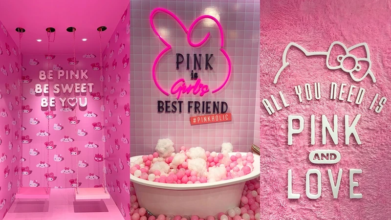 走進《Pinkholic 粉紅閨蜜期間限定店》,可以看到Hello Kitty的粉紅客廳、美樂蒂的浴室、大耳狗的仙人掌花圃,以及粉色夢幻鞦韆,牆上的粉紅金句也超正能量,像是「JUST BE SMIL-ISH,AND YOU'LL ALWAYS BE STYLISH!」、「ALL YOU NEED IS PINK AND LOVE」,粉紅力量一定要大拍一波。