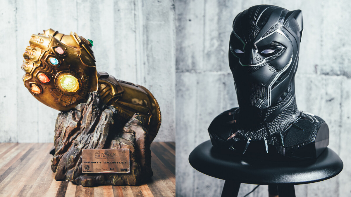 這次的系列共有「霸氣風」、「質感風」、「實用系」三大風格,「霸氣風」包括有1:1大小黑豹、鋼鐵人Mark46以及鋼鐵蜘蛛人的真人頭像投影藍牙音箱,其中還有1:1.5比例的《復仇者聯盟:無限之戰》無限手套更是必搶商品,由特殊金屬塗裝,模擬無限手套金屬材質,內建LED發光結構,讓六顆無線寶石隨著呼吸節拍閃爍,每座更擁有限量生產編號保證書。