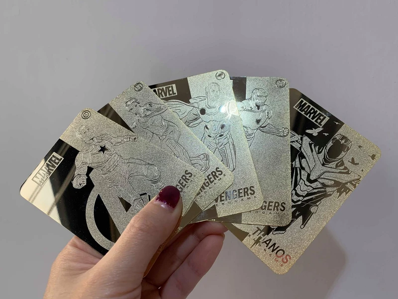 這次的紀念金卡共有5款,分別為鋼鐵人款、美國隊長款、雷神索爾款、黑寡婦款以及薩諾斯款,雙面鍍24K金,由於此部電影不只是系列最終章,更是許多初代復仇者的最後一部電影,因此紀念金卡則擷取了初代角色的肖像。