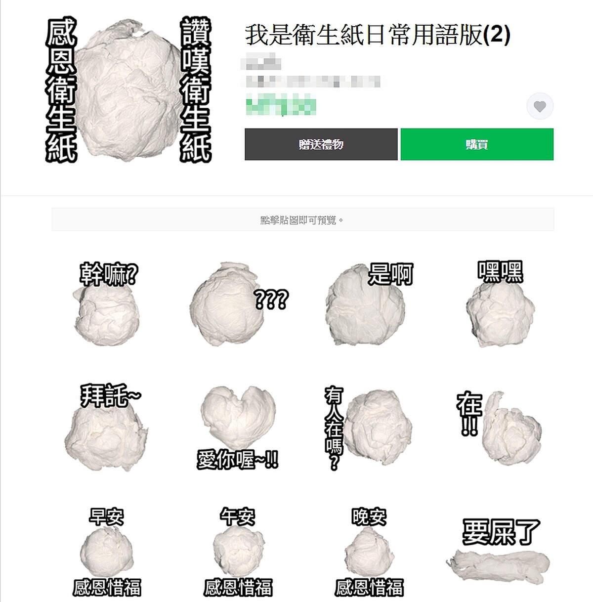 天啊!連衛生紙都有貼圖!把衛生紙捏成不同的形狀,搭配日常的用語,非常適合朋友之間拿來惡搞的小娛樂。