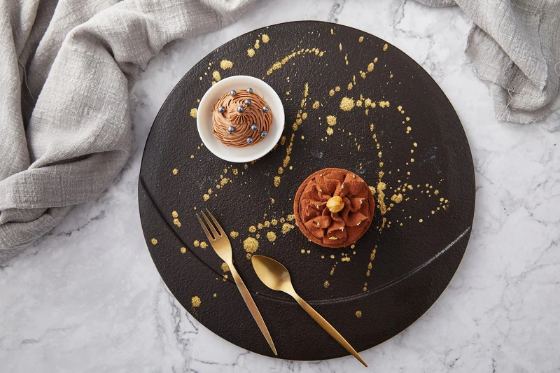 派翠西亞(Patrizia)為了喜愛巧克力的人也設計了〈Hazelnut chocolate tart 榛果巧克力塔〉,塔皮內填入榛果巴芮脆片,是使用比利時進口榛果醬,加入杏仁角、有著甜脆的口感。塔內以法國百年品牌Weiss 70%阿卡利亞巧克力,結合非洲、厄瓜多、千里達和托巴哥、委內瑞拉等四國頂極的可可豆,淬鍊出巧克力細緻微甜口感,後韻帶點紅漿果香氣。 表面的巧克力裝飾使用來自單一產區有直率可可風味,色澤略紅的Weiss笠初64%黑巧克力散發淺淺甘草清香,入口後綻放濃郁的香草風韻夾雜堅果飽滿濃郁的酸,擁有極為獨特的酸甜口感。