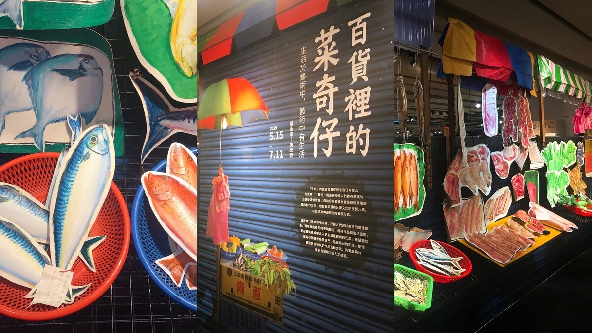 以當代藝術刻劃在地日常,誠品生活敦南店也邀請藝術創作者唐唐發,手繪擬真傳統市場攤位,打造「百貨裡的傳統菜市場」。