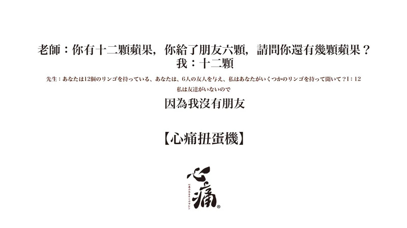 11. 「老師:你有十二顆蘋果,你給了朋友六顆,請問你還剩下幾顆蘋果?我:十二顆,因為我沒朋友」