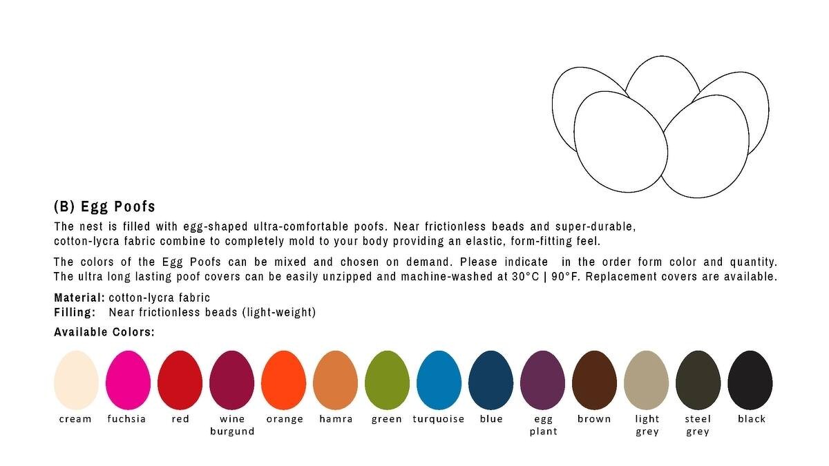 鳥巢沙發共有4種此寸,依據環境有不同此寸可以選擇,從單人座到16人的超大沙發都有,蛋形枕頭依照此吋大小更可以放入5顆放到23顆枕頭! 除了是一個沙發更可以是一個舒適的空間,可以躺在上面慵懶的休息、聊天!