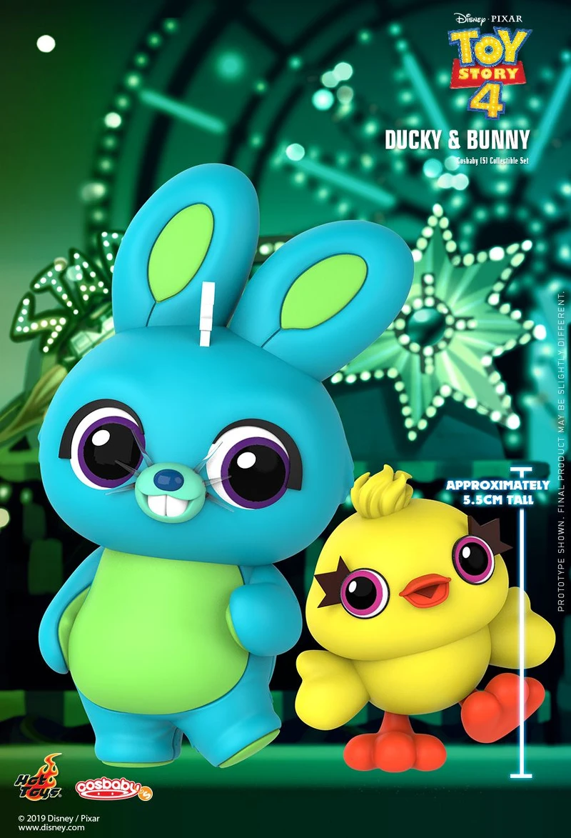 Hot Toys 的「Cosbaby」系列將胡迪、巴斯光年、三眼怪、牧羊女、抱抱龍、翠絲、彈簧狗等人氣角色Q版化以外,也加入了這次《玩具總動員4》推出的全新角色叉奇(Forky)、鴨霸(Ducky)、兔崽子(Ducky)……等等.每個角色將比例也Q化了,高度維持在3cm~11cm的大小左右,讓公仔們更加“玩具”化~