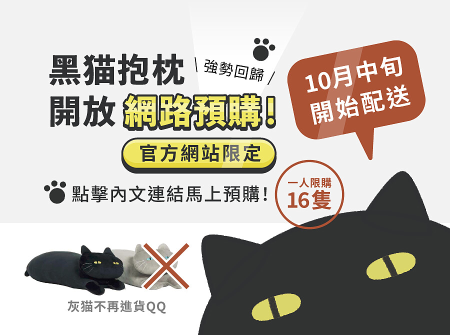 還記得前陣子洗版日本推特「黑貓抱枕」嗎?黑黑的身體配上厭世的黃色眼睛,在台灣一上市就當天秒殺,令不少人相當扼腕。但好消息是,現在已經強勢回歸,上次沒買到的妳,快點搶起來吧!