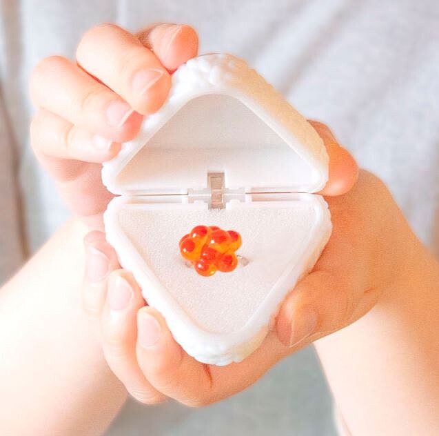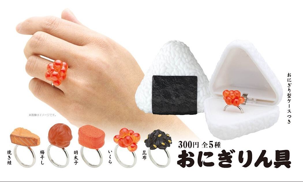 日本的扭蛋真的是無奇不有,除了一般生活小物、療癒公仔,現在進化到連求婚戒指都有了!日本的奇譚俱樂部時常推出許多趣味的扭蛋,扭蛋盒更擺脫傳統圓形,而是改成御飯糰的造型,裡面藏有餡料戒指,打開絕對會超驚喜~
