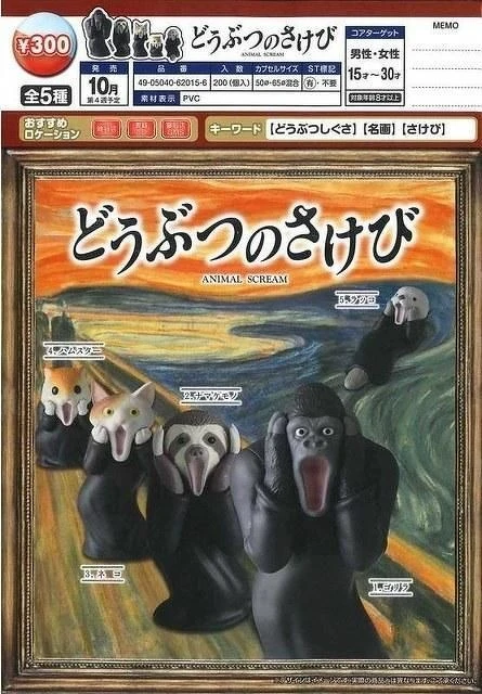 這幅經典作品現在被日本扭蛋公司EPOCH翻玩,推出「動物的吶喊ANIMAL SCREAM」系列,在首波公開的預告中,五隻動物如:樹懶、大猩猩、貓咪、倉鼠、海獺全部都驚訝地捧著臉頰,扭曲臉孔呈現可愛又搞笑的神情。