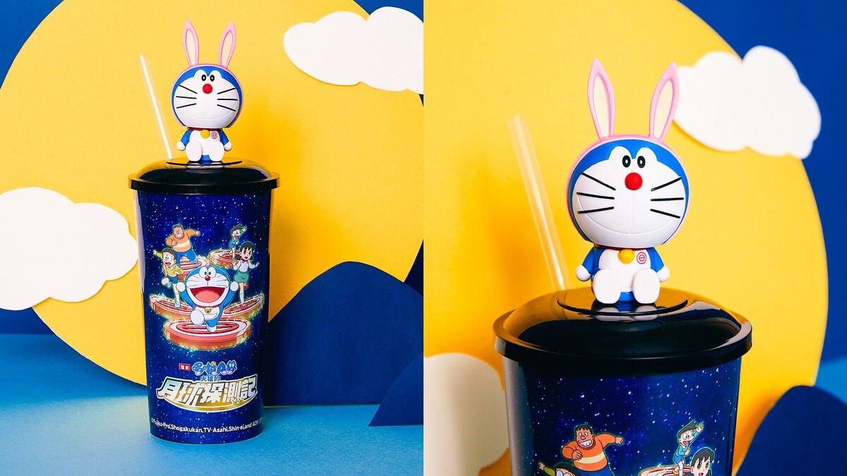 不只是「哆啦A夢電影版造型爆米花桶」用可愛月兔頭為造型,還有一款「哆啦A夢月兔公仔搖頭杯飲料」更是療癒滿分,杯蓋上的迷你呆萌公仔,輕輕一彈就晃頭晃腦,就算放在辦公桌看了也超級紓壓。