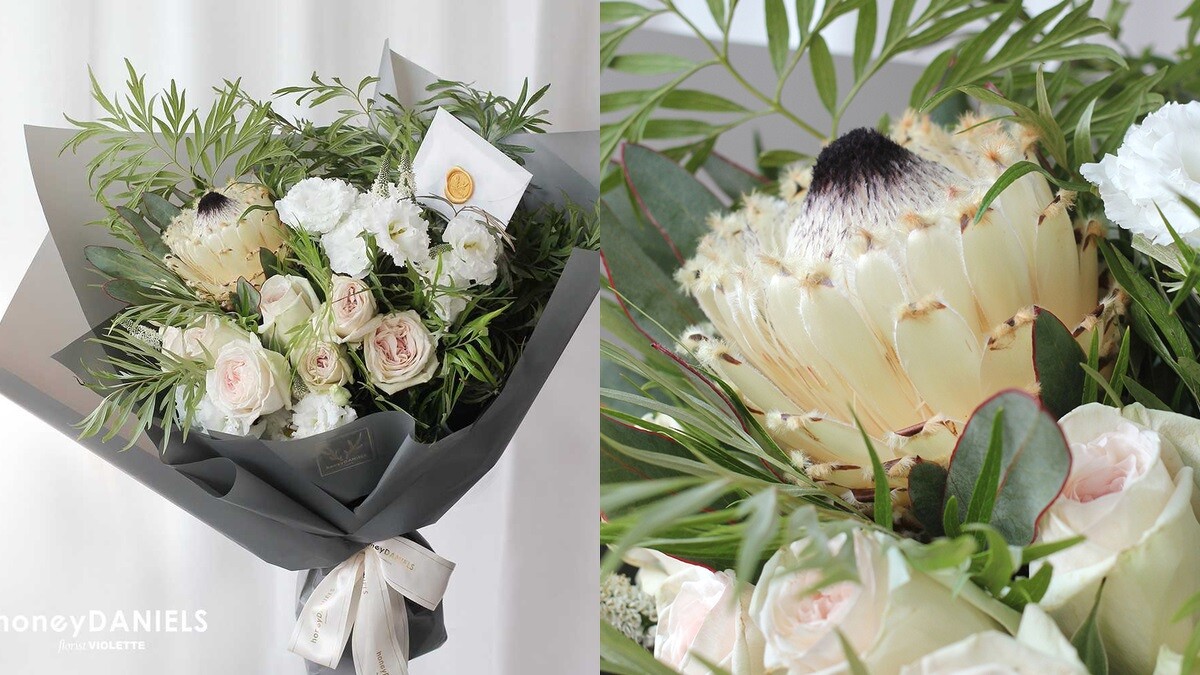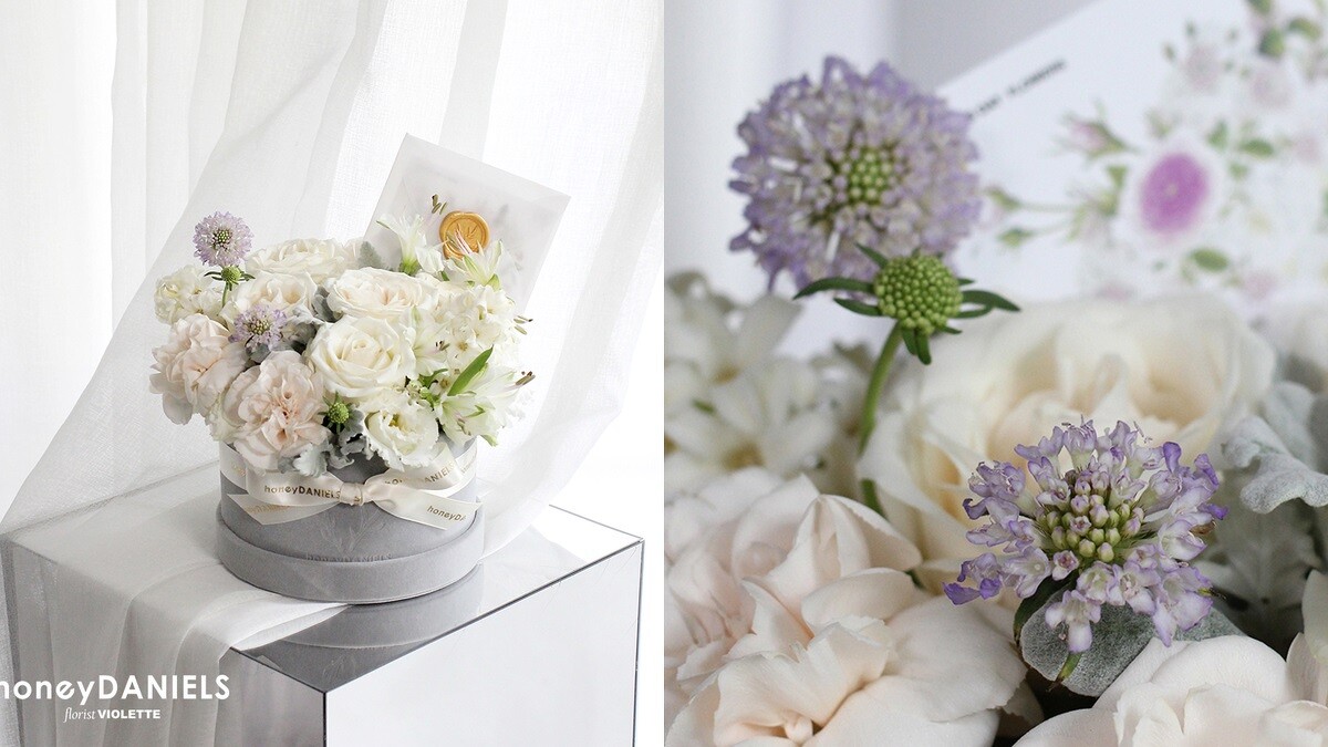 鏤刻純粹天真的白色記憶。白玫瑰、白色風信子、白順風草、白水仙百合、銀葉菊、康乃馨、紫松蟲,勾勒縱然時光飛逝,愛的形貌依舊,那份心意相通的純粹。
