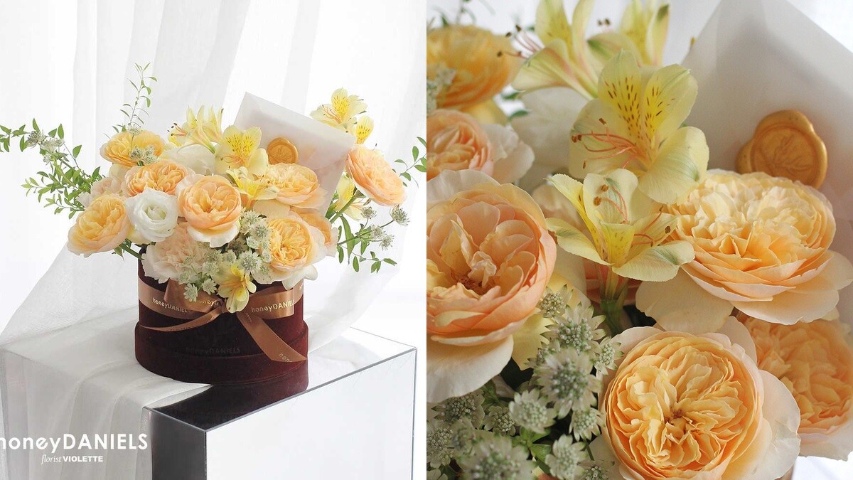 敘寫古典靜謐的亮橘戀人視角。杏粉田園玫瑰、杏色大康乃馨、白桔梗、雪柳葉,娓娓道出戀人心中雋永的記憶篇章。