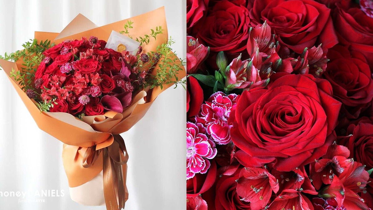 演繹烈愛風雲的殷紅雋永。紅玫瑰,紅石竹,紅水仙百合,紅海芋、紅松蟲與雪柳葉交織出溫柔渴望。