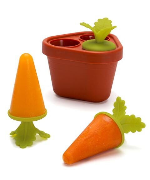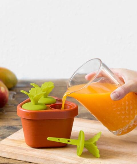 模型的外觀是超可愛的盆栽造型,將喜愛的果汁倒入模型中,在冰箱放置8小時後,一根根五顏六色的胡蘿蔔冰棒就誕生啦!