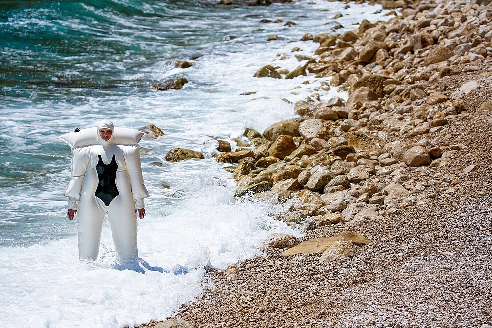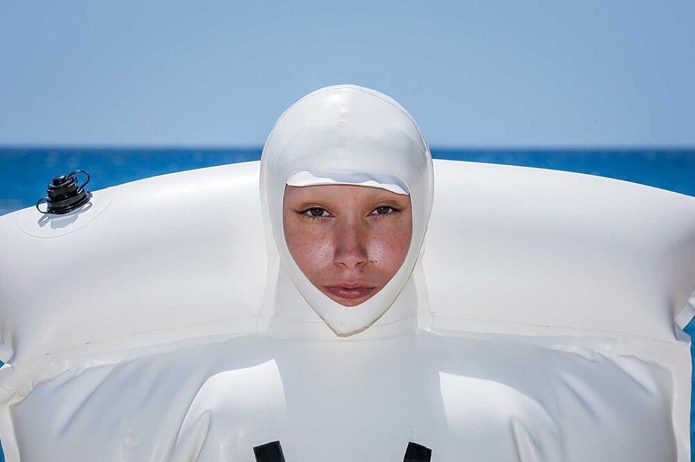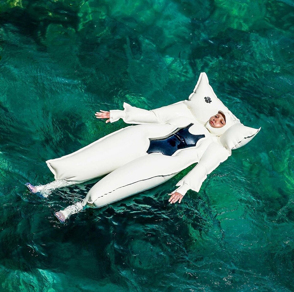 於是這款「全身式泳圈」就這樣誕生了,誇張的尺寸甚至比太空衣更巨大,穿上後一秒變身成「人體浮版」!只有小面積的臉、手背及腳掌區域會露出來,讓更多患有同樣疾病的人,或甚至不會游泳及怕曬黑的人,都能輕鬆漂在海上。