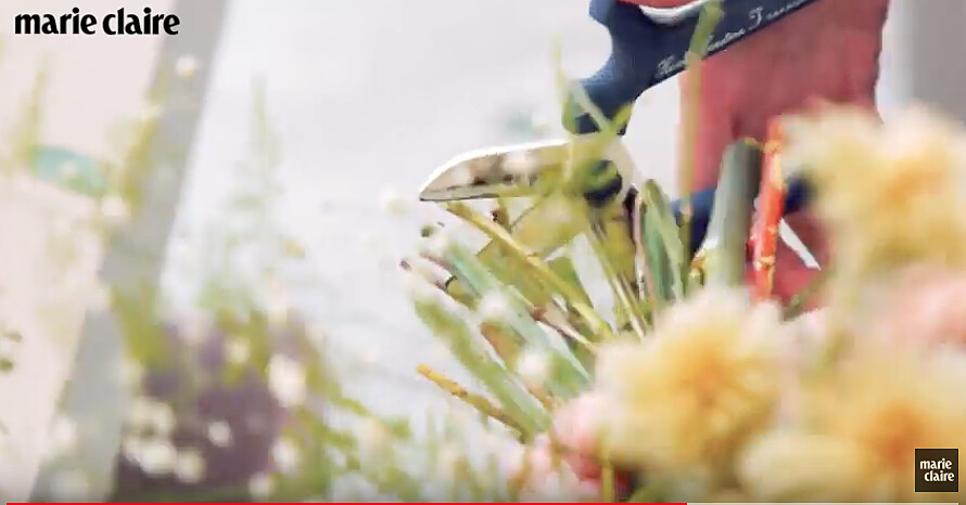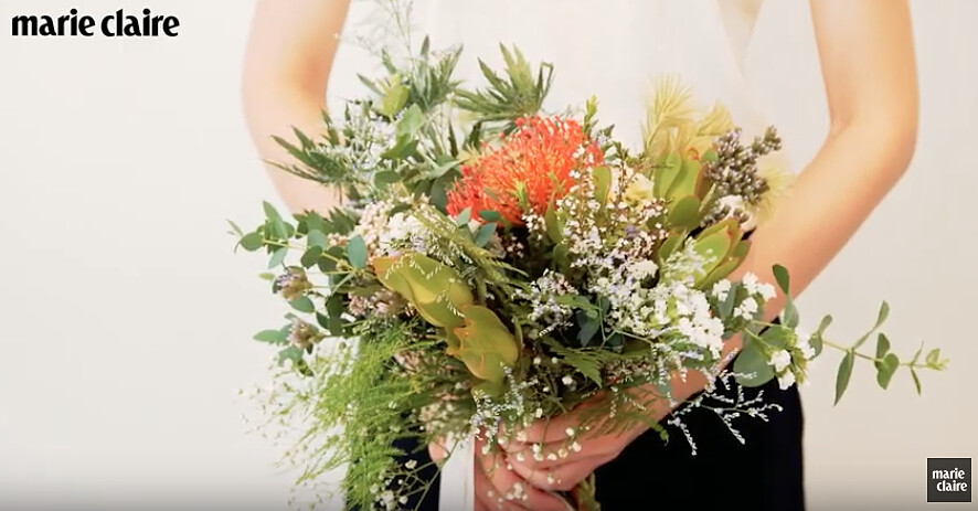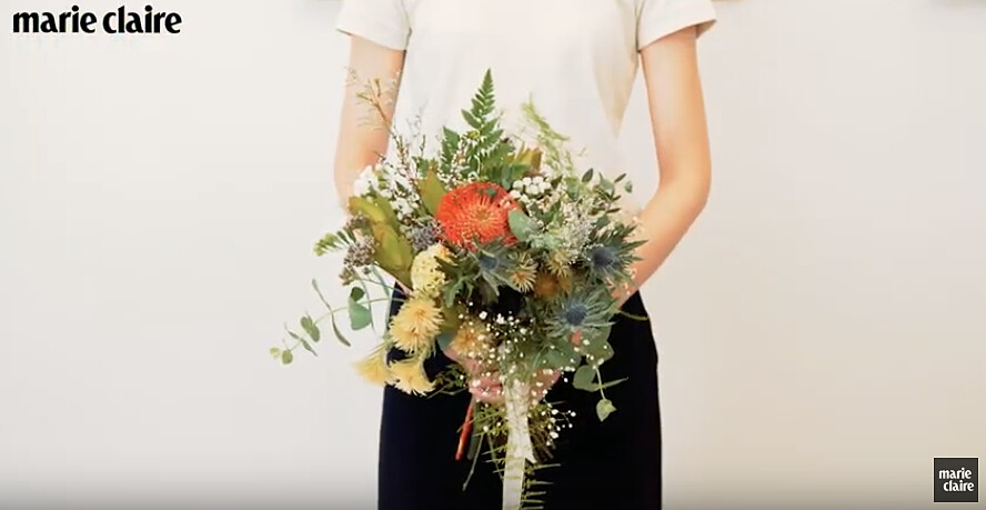 當花束的位置都調整完後,再將花的尾端(莖)剪齊,再以鐵絲固定,緞帶裝飾。