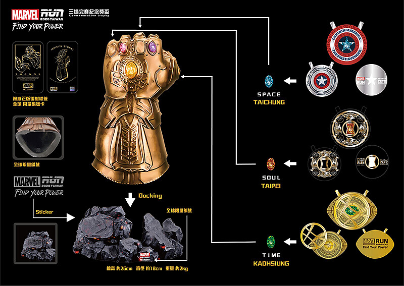 凡參加2020 MARVEL RUN TAIWAN路跑賽事台北、台中、高雄場次,獲得前三名之選手,可獲得薩諾斯(Thanos)-無限手套雕像組乙個(含無限寶石6顆)。