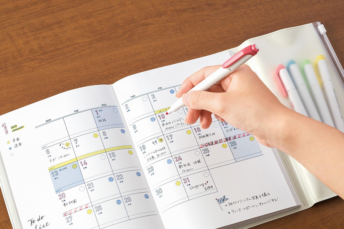 MIDORI及ART PRINT JAPAN則有著色月計畫手帳,刻意留白設計的內頁,可以在預定的日期塗上顏色,也可以在空白處畫上心情與天氣,快大展藝術天分,運用顏色及插畫打造專屬手帳。