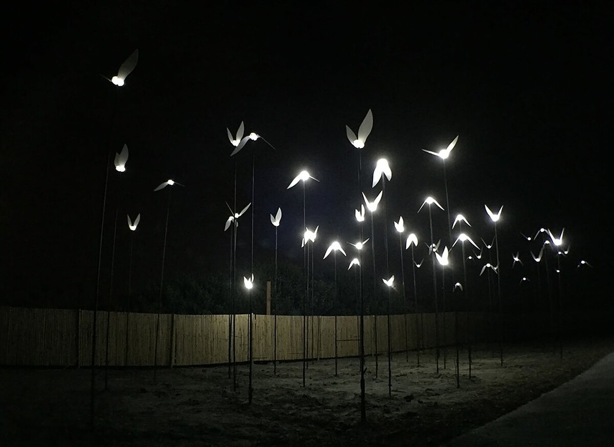 在洲子一號公園上會看到眾多的「光影變化飛鳥」,則是盂施甫的作品《候鳥 Migratory Bird》,齊聚排列及循序漸進的光影變化,象徵著遊子們始終嚮往的溫暖家鄉意涵。捷運劍南路站3號出口樓梯還有錄像藝術《緩緩上升 Slow Rise》,不妨靜下心來觀察這你我熟悉的城市片刻。