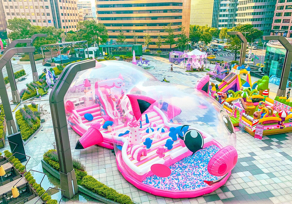 統一時代百貨台北店迎接9周年,除了企劃「九大王牌」成為周年慶吸睛亮點,2樓戶外夢廣場更有「雙樂園」!最吸睛的莫過於超巨大的「粉紅萌萌豬氣墊城堡樂園」,以全透明圓頂式設計,裡面更有著繽紛球池,絕對讓小朋友玩到不亦樂乎。