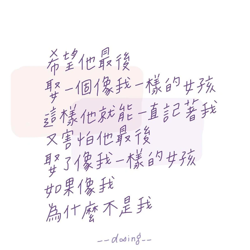 希望他最後娶一個像我一樣的女孩,這樣他就能一直記著我。又害怕他最後娶了像我一樣的女孩,如果像我,為什麼不是我?