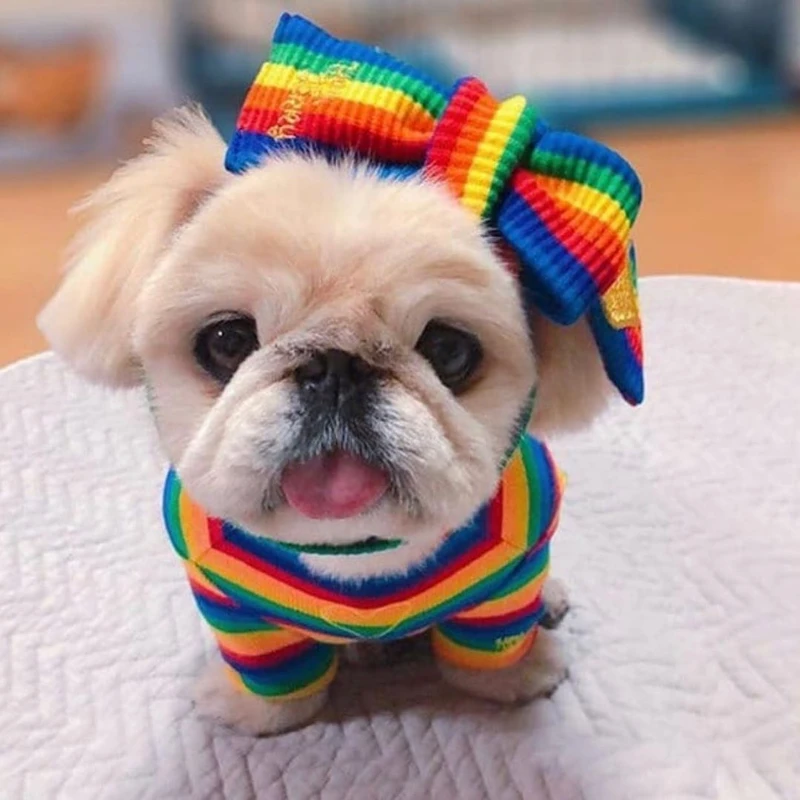 小狗穿上彩虹裝嘻哈裝看起來走在彩虹的尖端~