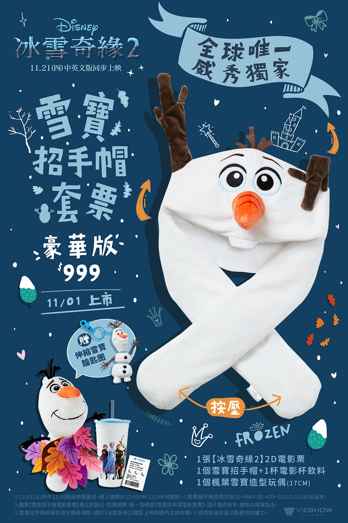 另外雪寶還化身成俏皮招手帽造型,毛茸茸的親膚質感,配上左右兩旁的樹枝小手,輕壓一下底部空氣球就能高高揮手,俏皮十足,最亮眼的當然莫過於「巨無霸訂製雪寶」,身高70cm、價值30,000元,只要在個人社群平台上分享戴上雪寶招手帽照片,並#威秀影城、#冰雪奇緣2,再到威秀影城粉絲團活動貼文下方截圖留言,就有機會獲得唷!