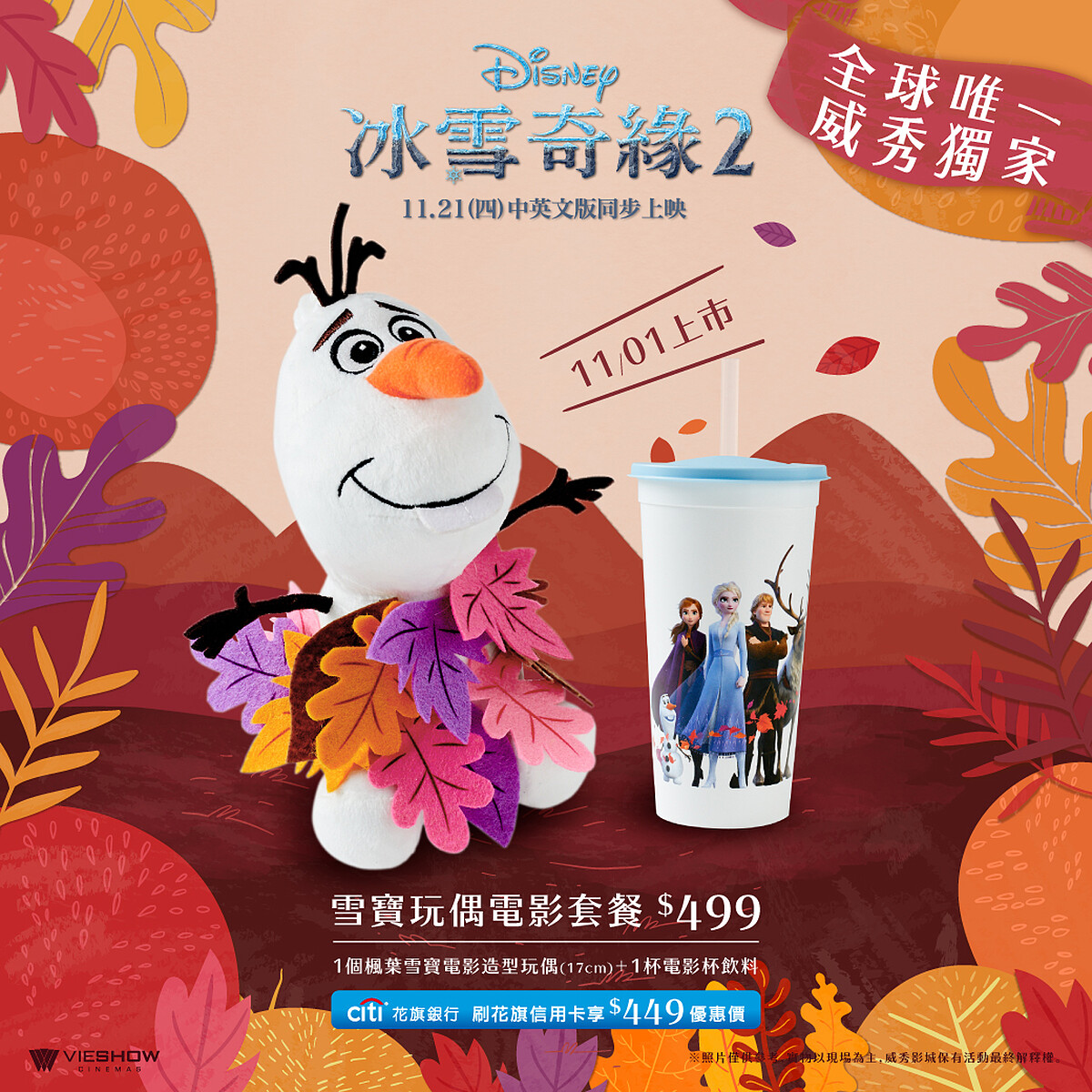 「雪寶玩偶電影套餐」:售價$499,含1個楓葉雪寶玩偶及1杯電影杯飲料,刷花旗銀行信用卡可享優惠價格$449。