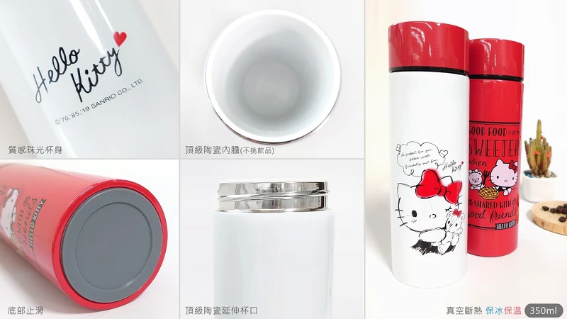 這次的「Hello Kitty陶瓷保溫杯」是台灣第一支陶瓷保溫杯,外杯身採用食品級304不鏽鋼及珠光烤漆,杯身採雙層結構真空斷熱,保溫時間長,而內層採用頂級陶瓷,好處是不留味、耐腐蝕、易清洗,能夠長時間維持良好品質。