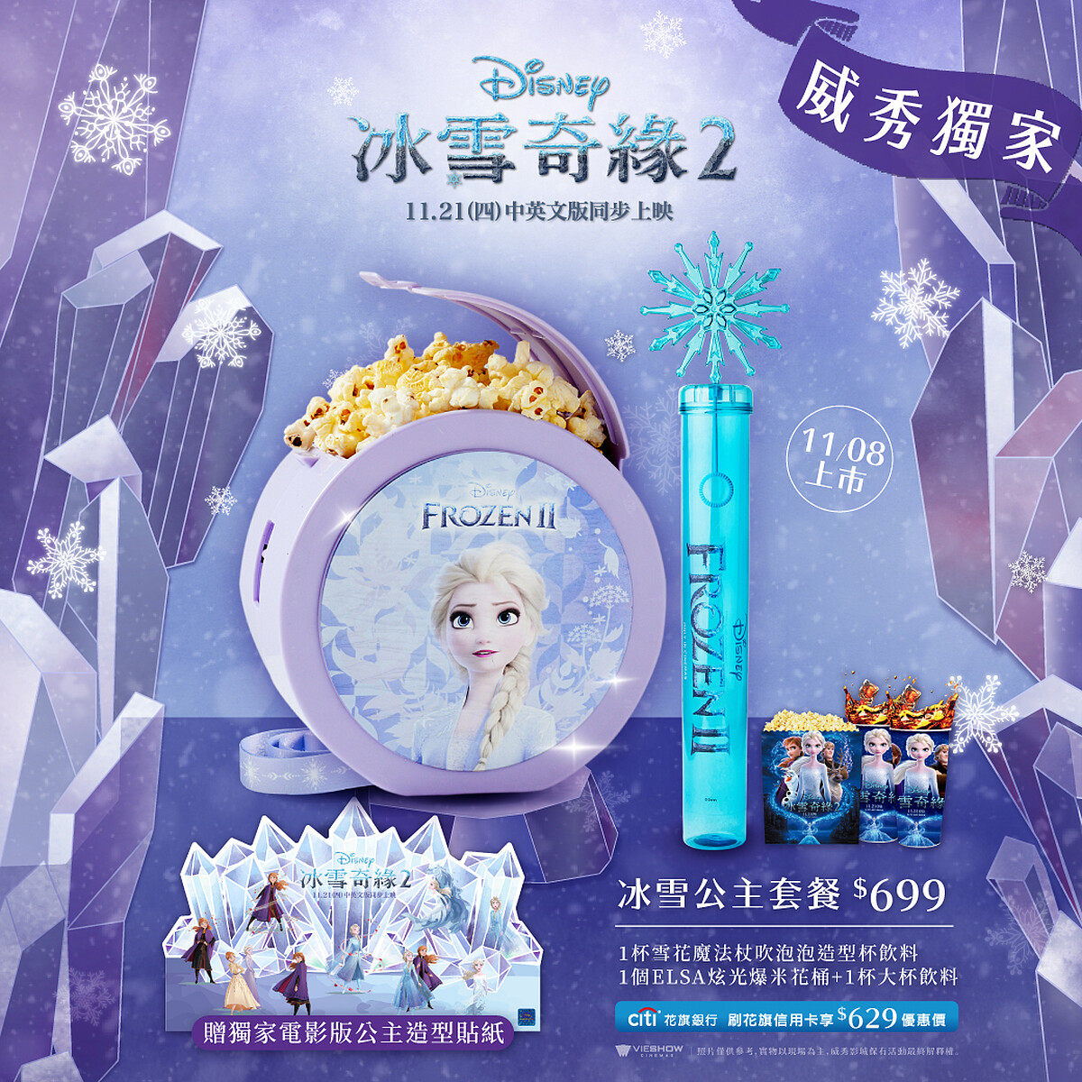 套餐內容:1個ELSA炫光造型爆米花桶+1杯雪花魔法杖造型杯飲料+1杯大杯飲料,贈送「獨家電影版雪寶貼紙」
