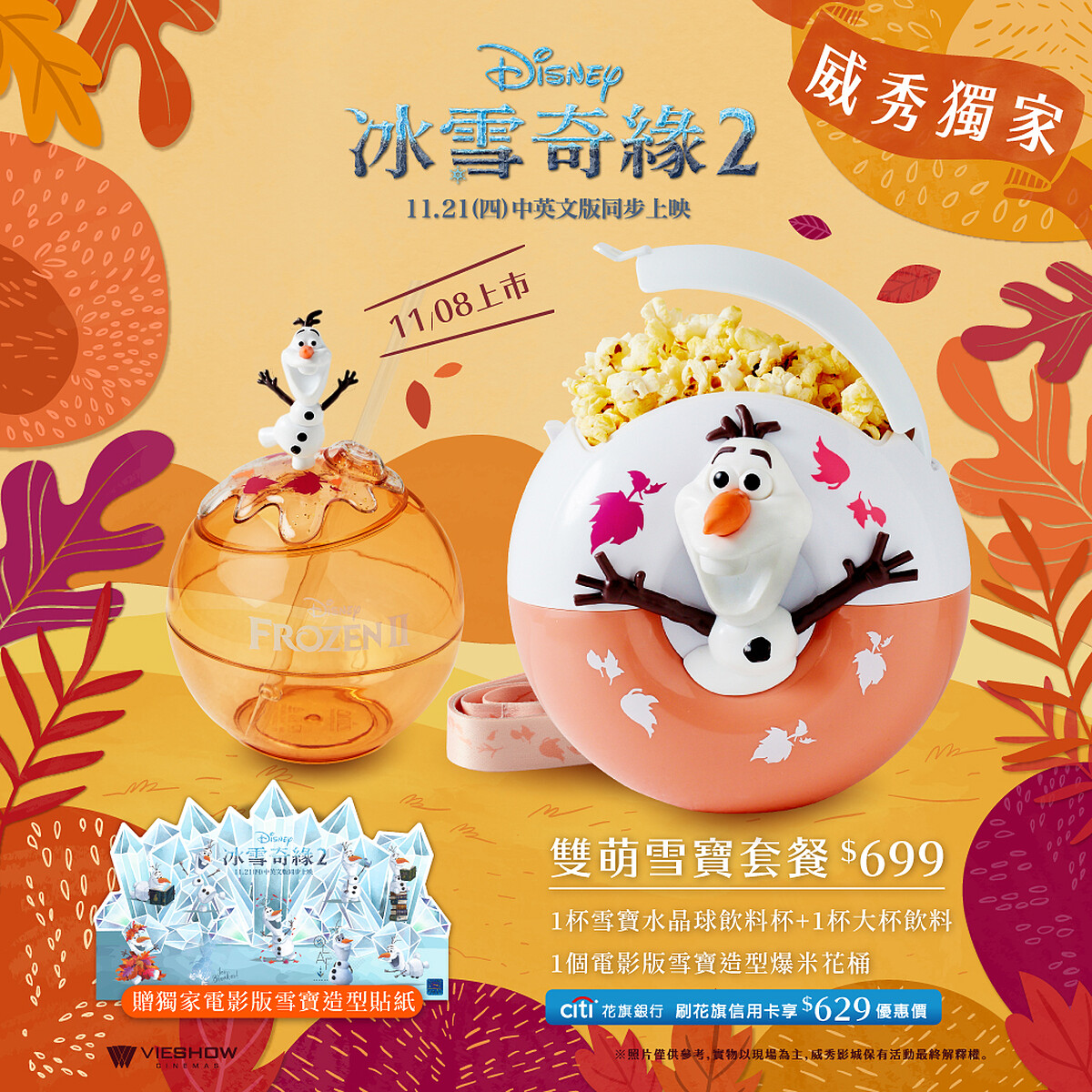 套餐內容:1個電影版雪寶造型爆米花桶+1杯電影版雪寶水晶杯飲料+1杯大杯飲料,贈送「獨家電影版雪寶貼紙」