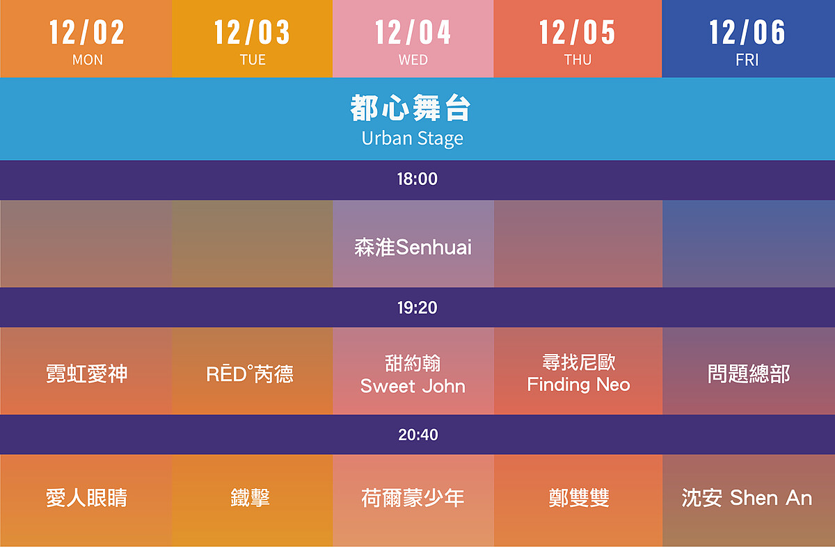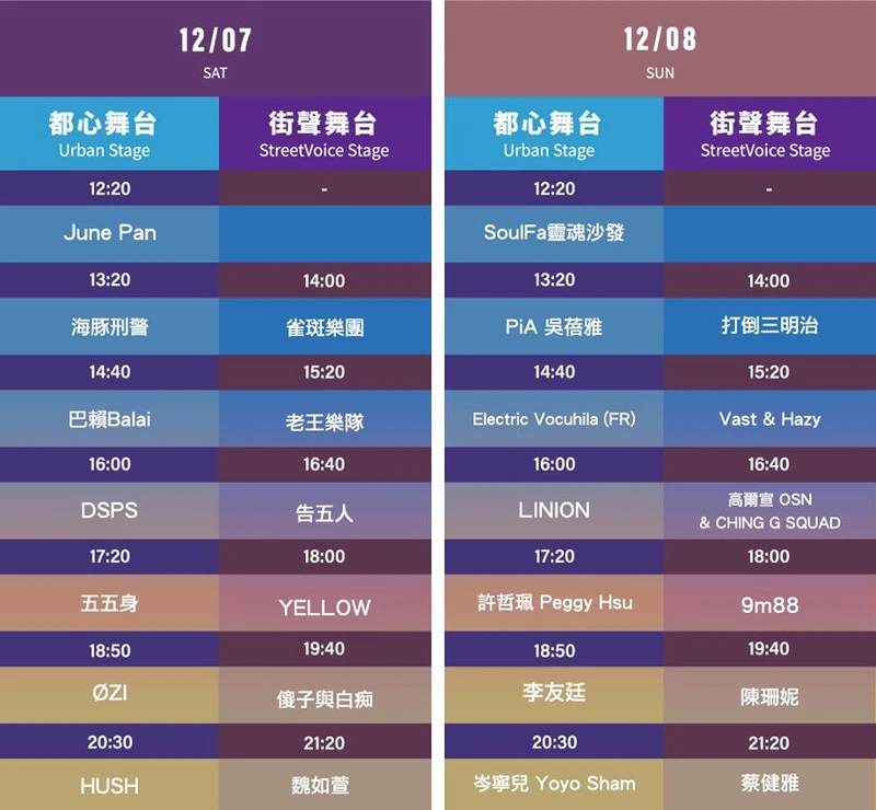 表演卡司如同往年般精彩,共會有63組音樂人,會在雙舞台:都心舞台/街聲舞台輪番上陣,包括蔡健雅、陳珊妮、魏如萱、艾怡良、ØZI、孫盛希及Leo王、高爾宣、9m88等。並會有超過100個創意品牌、藝術家打造燈光藝術裝置,讓大家能一邊聽音樂,一遍盡情逛市集、大拍美照。
