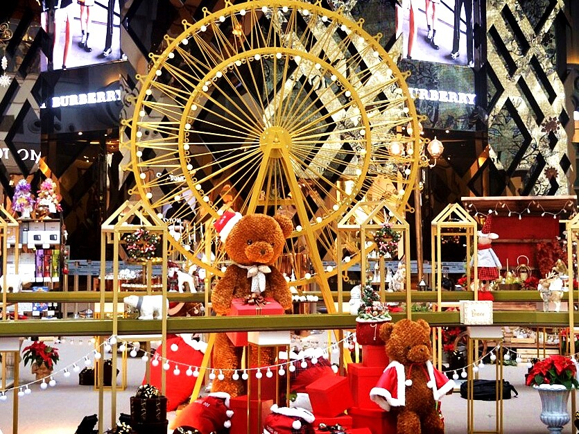 與往年不同,台北101今年把耶誕佈置分散到百貨各處,從上到下、從裡到外都能感受到濃厚的節慶FU。最不能錯過的,當屬4樓都會廣場的「耶誕禮物夢工廠」,有金色的摩天輪、正在忙著包裝禮物的小熊工人,身邊還有輸送帶,展示著精緻的禮物及繫上蝴蝶結緞帶的禮物盒。若不小心沈船進這波聖誕氣息,可以到一旁的HOLA、Le Moment購入聖誕老人娃娃、吊飾或花圈。