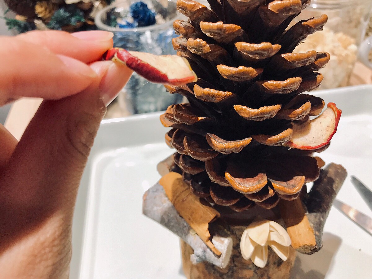 放入具有香氣的葉材如肉桂棒也會讓聖誕樹帶有些許香氣更加療癒人心!