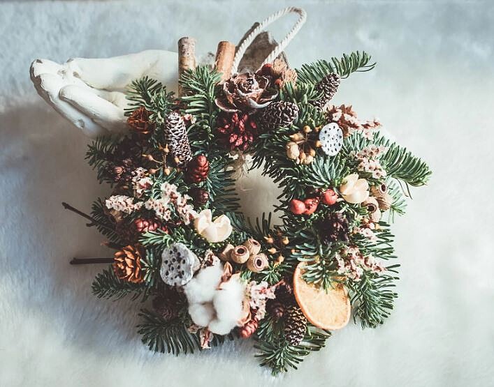 課程中會提供多樣化的素材讓大家運用像是諾貝松、雪松、扁柏、尤加利葉、蘋果桉,還有裝飾的葉材、虎眼、棉花、香橙片、松果、肉桂棒....等來布置聖誕樹!