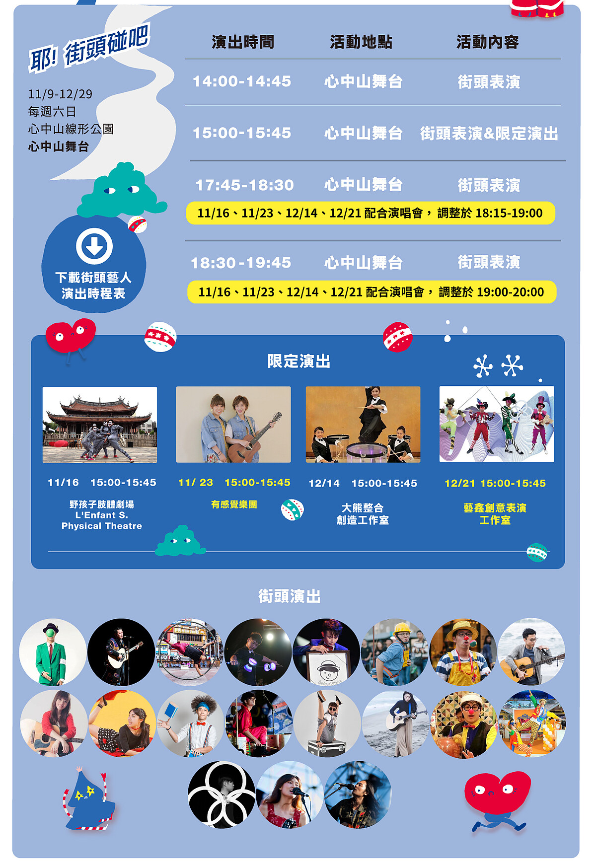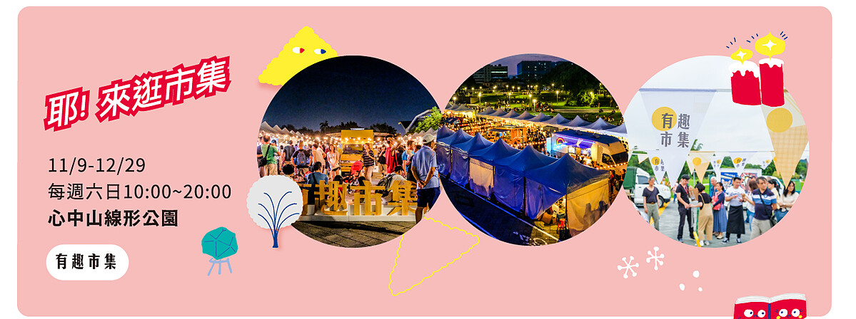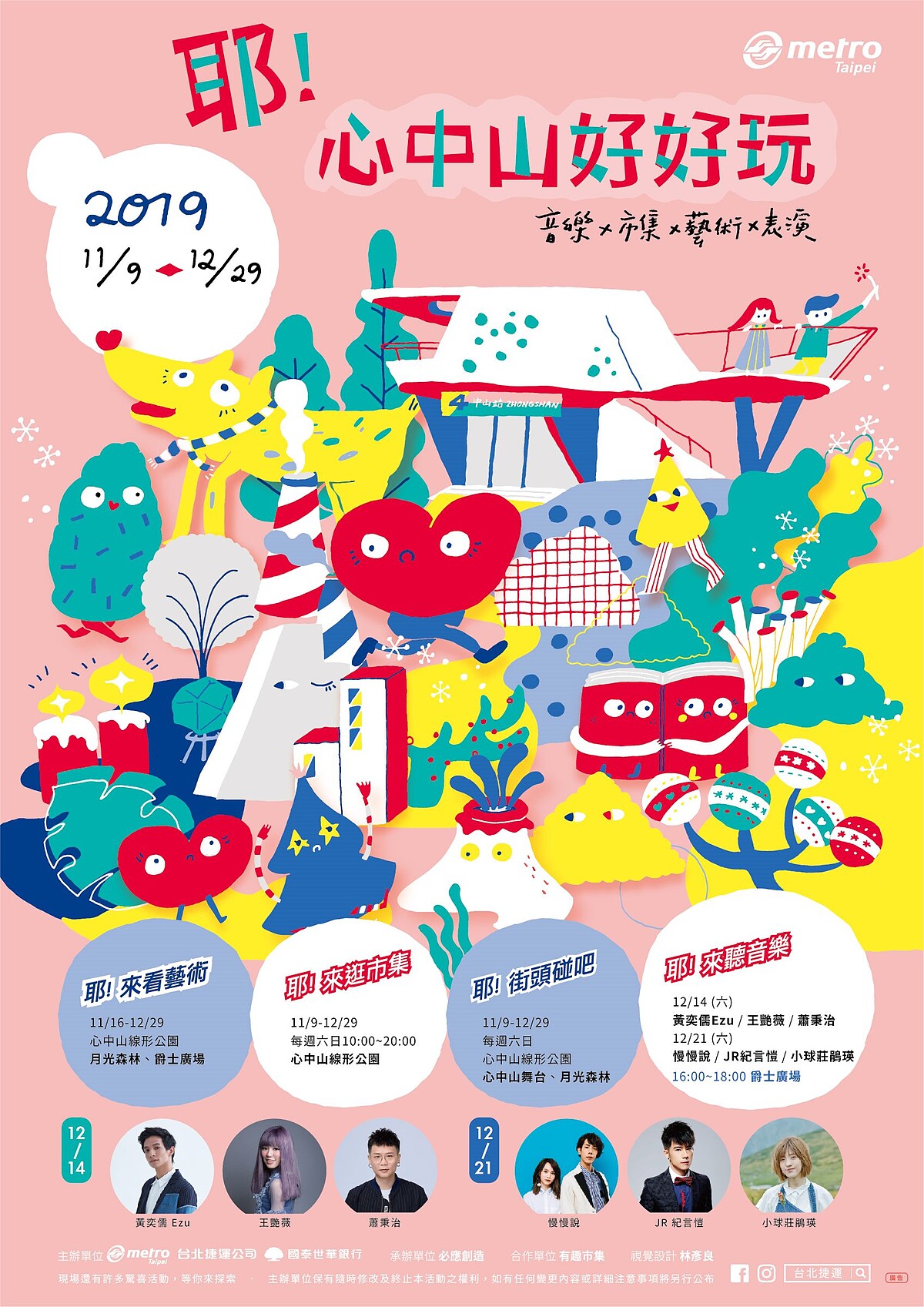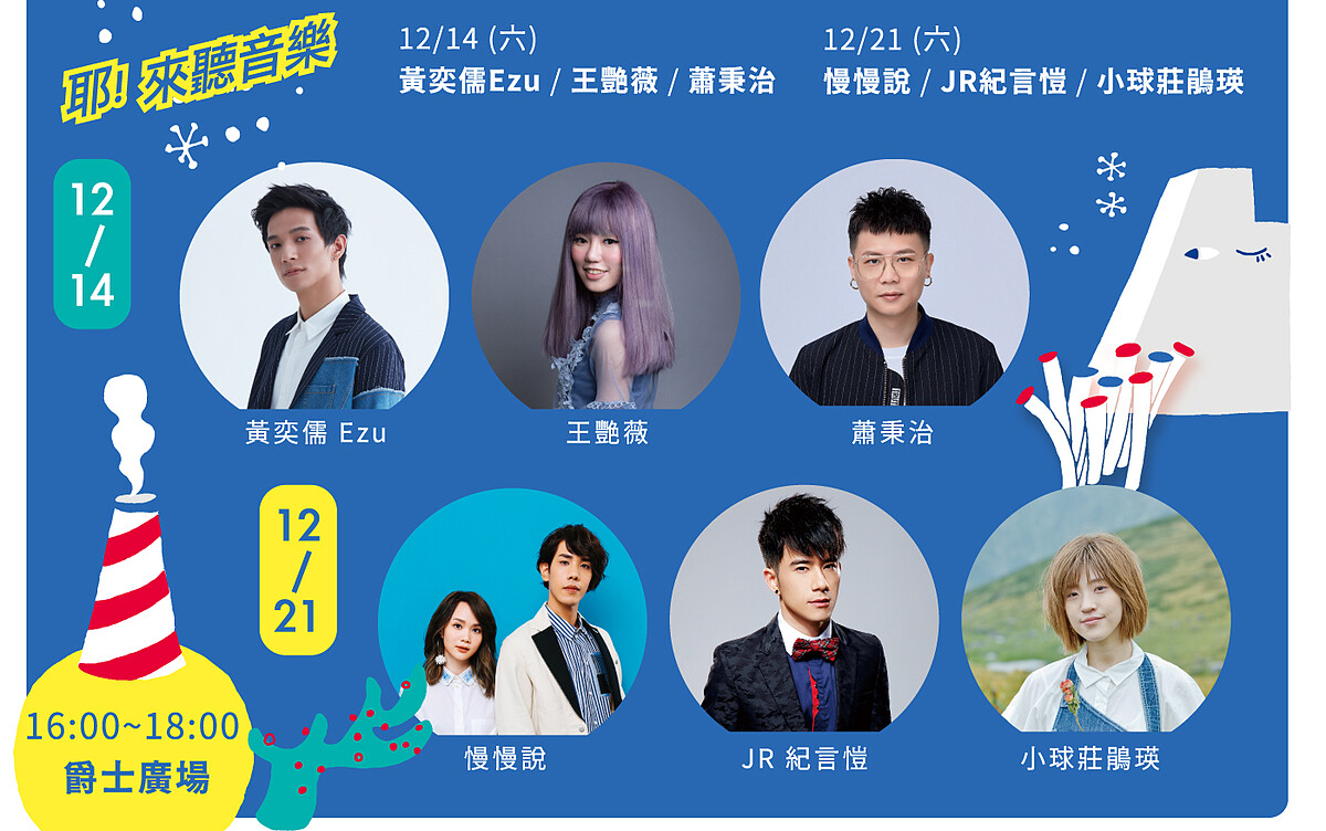 另外在12/14、12/21都有「耶!來聽音樂」活動,將會有黃奕儒、王艷薇、蕭秉治、慢慢說、JR紀言愷、小球等歌手表演;週末在心中山線形公園也都有有趣市集的「耶!來逛市集」、更有「耶!街頭碰吧」街頭表演。好玩又好拍的期間限定活動,怎麼能錯過?